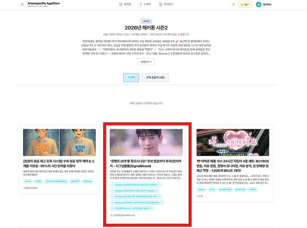 홈 / 성장기록 / 사내 바이브 코딩 해커톤 1일차 성장기록 사내 바이브 코딩 해커톤 1일차 Jay Teo April 13, 2026 14:37 조회 2 image.png 363 KB 20위에서 2등까지 올라왔다 너무 좋다 0 댓글 0 로그인하고 댓글을 남겨보세요.
